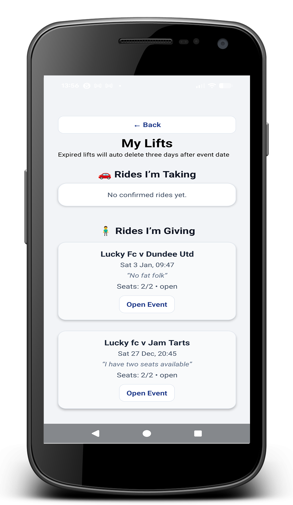 Parents can offer or request lifts. Matchday chaos becomes simple and organised.