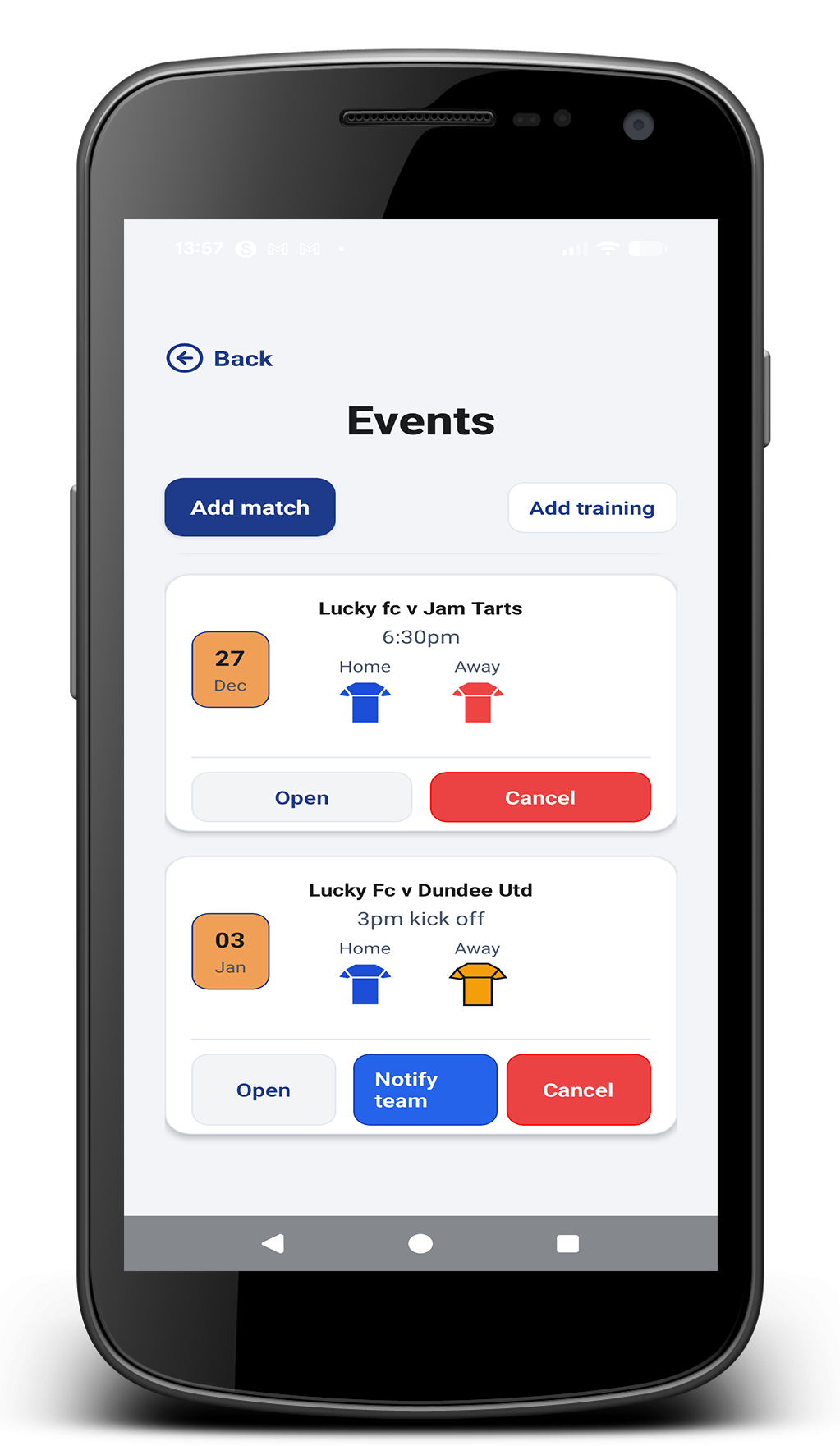 Create matches and training sessions with full details. Parents instantly see kick-off time, meet time, strip, location and reminders — no more missed messages.